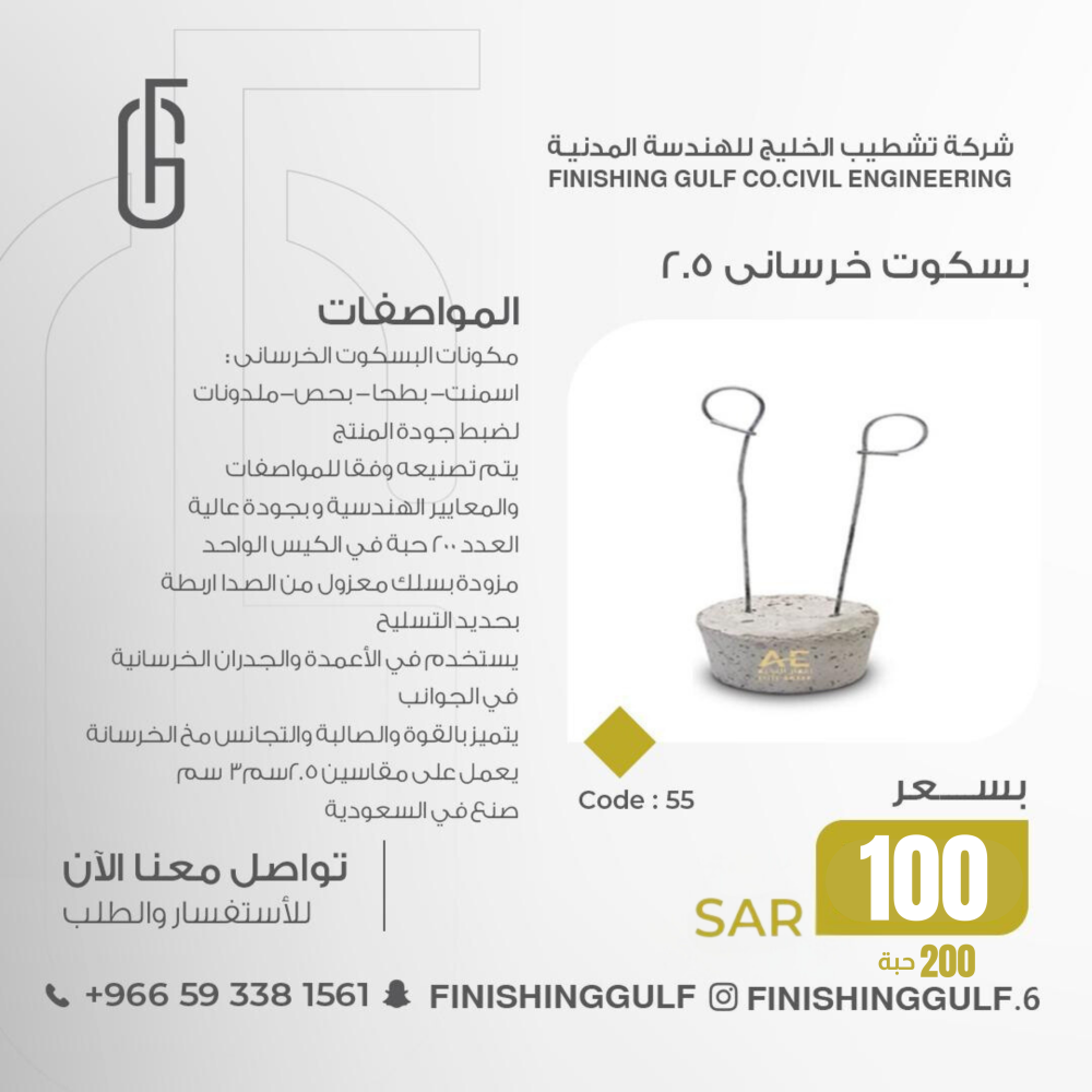 مكونات البسكوت الخرساني : أسمنت – بطحا – بحص – ملدونات لضبط جودة المنتج ، يتم تصنيعه وفقاً للمواصفات و المعايير الهندسية و بجودة عالية ، العدد 200 حبة في الكيس الواحد – مزودة بسلك معزول من الصدألربطه بحديد التسليح – يستخدم في الأعمدة و الجدران الخرسانية في الجوانب – يتميز بالقوة و الصلابة و التجانس مع الخرسانة ، يعمل على مقاسين 2.5 ، 3سم – صنع في المملكة العربية السعودية.