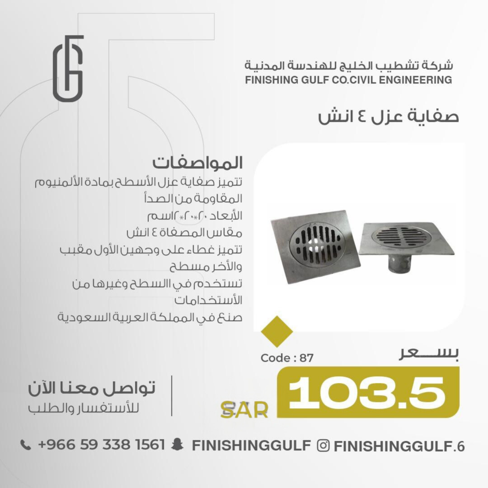 تتميز صفاية عزل الأسطح بمادة الألومنيوم المقاومة للصدأ – الأبعاد 20*20*12سم – مقاس المصفاة 4 إنش – تتميز بغطاءعلى الوجهين الأول مقبب و الآخر مسطح – تستخدم في الأسطح و غيرها من الاستخدامات – صنع في المملكة العربية السعودية
